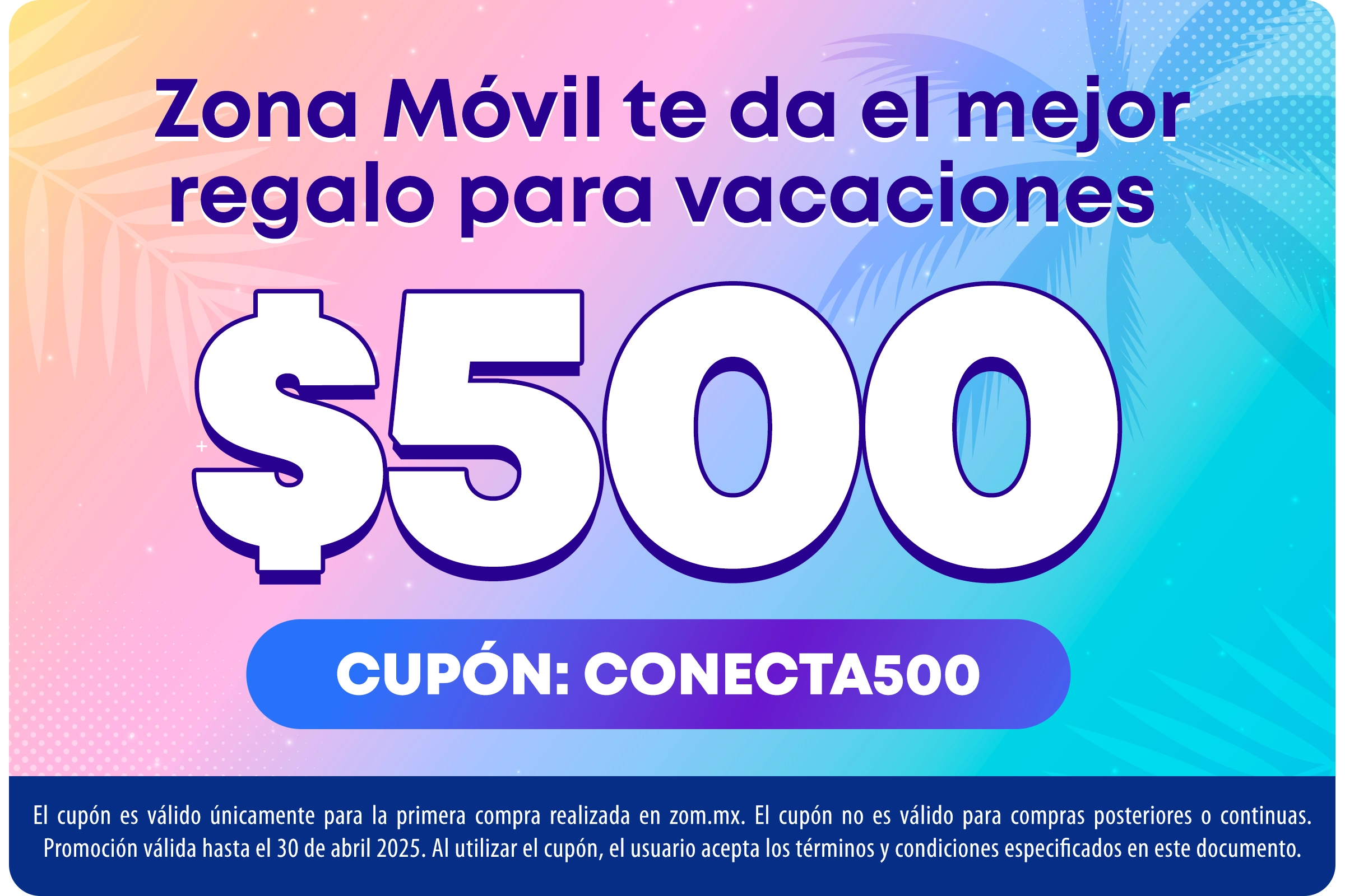 1. Promociones vigentes hasta el 30 abril 2025 o hasta agotar existencias, las promociones no son acumulables o aplicables con otras promociones, sujeto a cambios sin previo aviso. 2. Promociones exclusivas en la página web: www.zom.mx. (para tener acceso a las promociones es necesario que el cliente se registre y así cuente con un perfil). Las promociones están sujetas al tipo de perfil de cada cliente, el cuál será determinado por el mismo cliente al momento de realizar su registro (todos los registros pueden tener una segunda validación para nuevas promociones de acuerdo a las nuevas necesidades del cliente) 3. Precios disponibles en toda la República Mexicana de acuerdo al perfil registrado del cliente, consulte tiempos de entrega en nuestros términos y condiciones, disponibilidad sujeta a la Región del cliente, de acuerdo a las 9 Regiones establecidas por Telcel. 4. Para mayor información, comunicarse al 55 5424 7095, opción 2; de lunes a domingo de 9 a 20h, o al correo: contacto@zom.mx. 5. Consulte nuestro “Aviso de Privacidad” así como nuestros “Términos y Condiciones” en nuestra página web (para conocer métodos de pago, garantías, tiempos de entrega y acerca de los datos proporcionados en sus registros o ventas). 6. La promoción del cupón descuento de $500, sólo aplica para la primera compra del cliente y se aplicará al monto final ticket (no aplica al costo inicial del producto en caso de descuento o promoción). 7. Los artículos promocionales estarán sujetos a disponibilidad y hasta agotar existencias así como a los montos mínimos requeridos para ser sujeto a uno, se aplicará al monto final ticket (no aplica al costo inicial del producto en caso de descuento o promoción o código promocional).