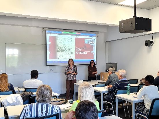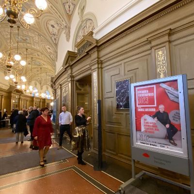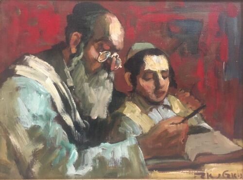 In Rabbi and Student, a rabbi with a long white beard, glasses and black kipá has next to him, on his left side, a young student in white kipá. Both are looking down at an open book in front of them on the table. The rabbi has his left hand on the student's left shoulder, and he holds a pen in his closed right hand. The background is neutral in shades of red, blue and grey.