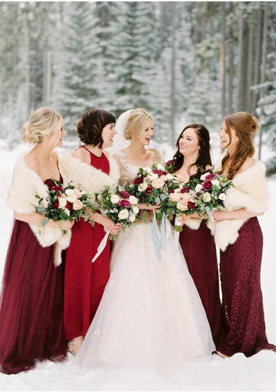 - Fur is making a huge comeback. Now we are not saying we agree ethically with real fur; however, most fur coats and stoles are faux. Some are vintage, therefore it is a recycled use of a fur that has been in a closet for years. You decide what you want to wear on your wedding day and ask your bridal attendants to stay warm and wrap up in a fur stole or shawl, with a contrasting color from the one you choose. Even accent with a muff instead of carrying a bouquet. check out this website: https://www.sissily.com/collections/faux-fur-shawls or luxuryvintagegirl.com