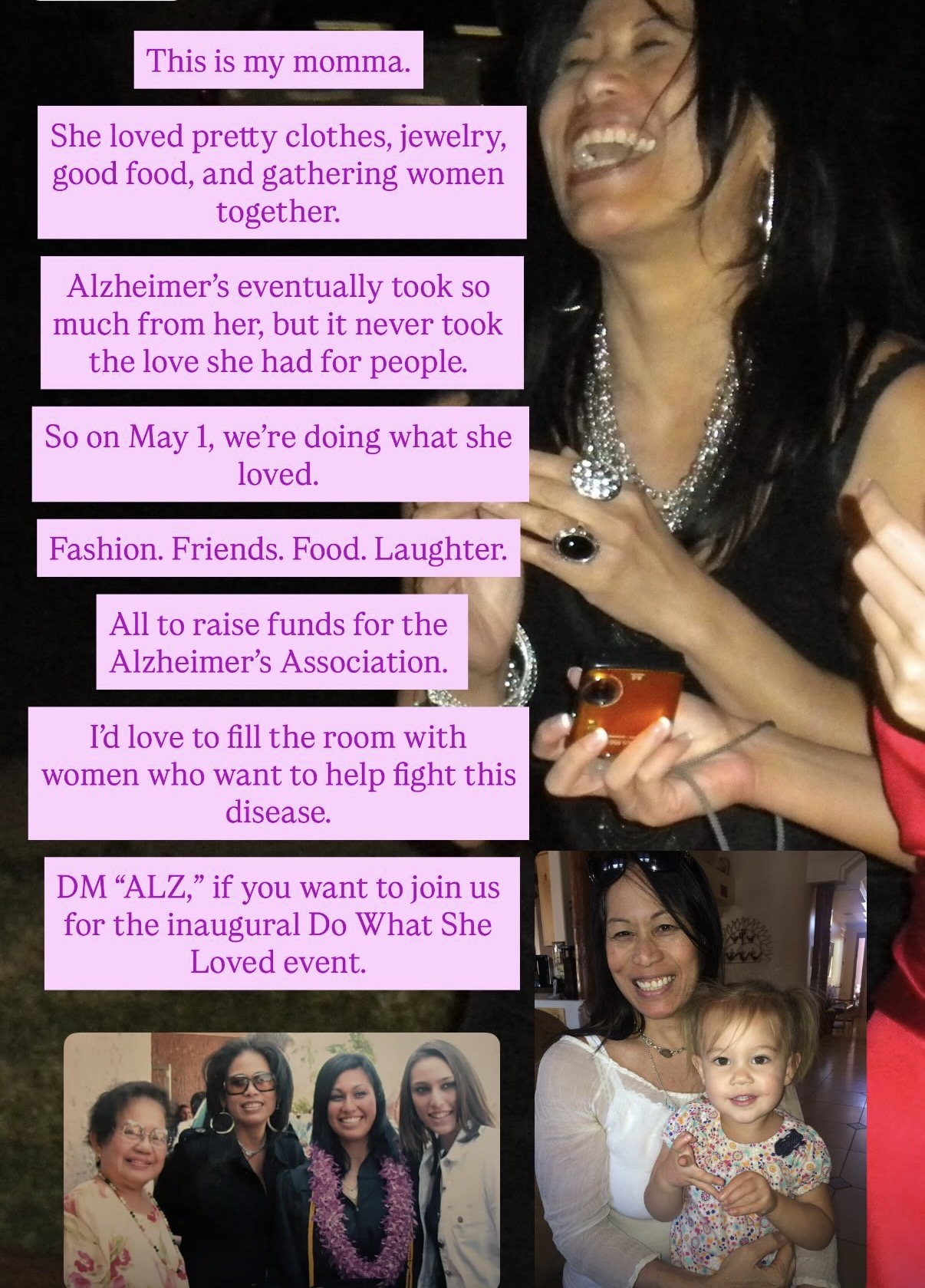 Hosting this event feels incredibly meaningful to me. It’s a way to honor my mom in a way that reflects who she was — joyful, generous, and always bringing people together.
